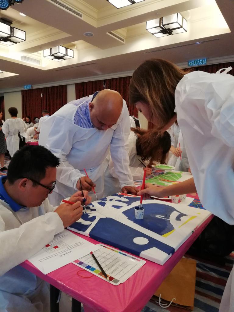The Big Picture team building exercise commences with individuals joining into small teams. Teams collect brushes, paint, a diagram outlining their individual canvas and, a blank canvas. They then set about as a team to mix paints to create the right colours and paint their canvas. Soon into the exercise, teams realise that in order for the overall artwork to be successful they need to collaborate with other teams. Once complete, the highlight of The Big Picture is the final reveal where, following a debriefing session, the masterpiece is unveiled to all participants for the first time, which always results in loud cheers and thunderous applause.